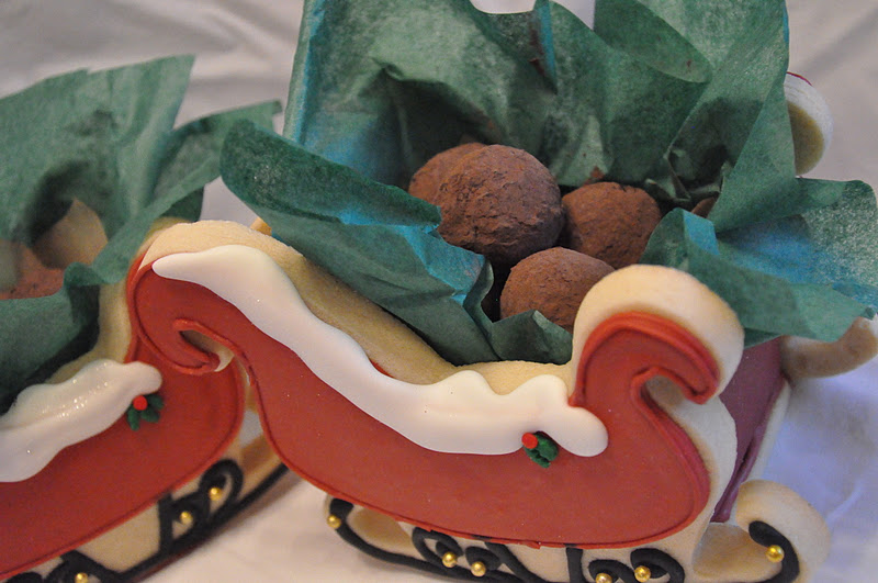 Once all the pieces have a full 24 hours to dry so the royal icing is hard, the sleigh can be carefully glued together with royal icing. I supported the sleigh between heavy boxes to dry so it wouldn't fall apart. Leave at least 12 hours preferably another 24 hours to ensure the icing is hard and has bonded the sleigh together. At this point I filled each sleigh with an additional treat of homemade truffles! You could certainly fill these with anything from more decorated sugar cookies to an non-edible gift.