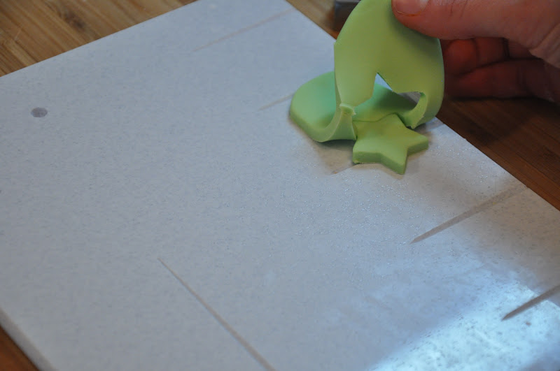 Starting with gumpaste in a sausage roll, use your cell pin to roll the paste over the cell board's lines to the desired thickness. For these stars, I rolled my gumpaste to about 1/4 inch thick.